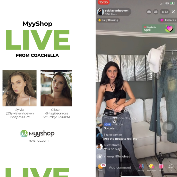 除了头部网红合作,MyyShop还专门为小微网红打造了TikTok Rising Star项目。Silvia 和Gibson是Tiktok上的后起之秀。在积累了数十万粉丝之后,一直在寻找影响力变现的更高效途径;此次和MyyShop一起亮相科切拉音乐节,出色的外形和潮流的穿搭,让她们收获了一大批新粉。加入MyyShop社交电商平台扩大自己的影响力,让她们的网红事业打开新思路。此外,MyyShop还快速为他们对接了平台商家,科切拉期间,粉丝们走进她们的直播间在观看她们的分享科切拉之旅的同时,拔草优质好物。